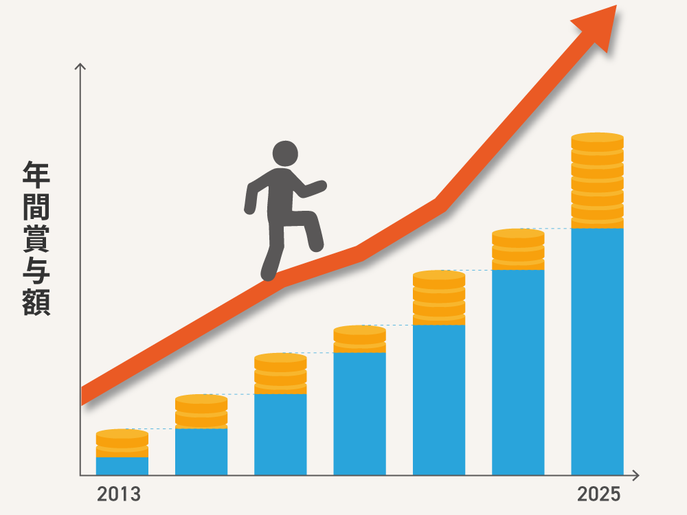 日々の業務を着実に積み重ね、その成果が評価として反映されることで、毎年の賞与が段階的に伸びていく構造となっています。 - こうした仕組みのもと、2025年度の賞与実績は、平均でおおよそ4.5カ月分の支給となっています。